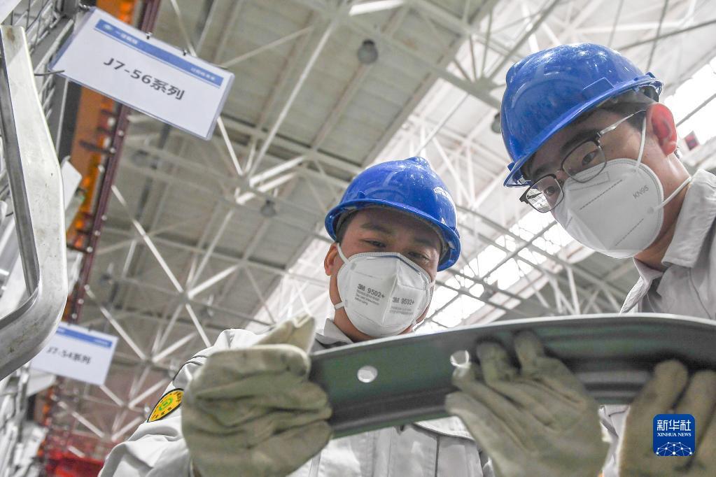 12月1汽車零件貿易商4日,在位于長春的一汽奧迪零件解放汽車機油芯汽車有限公司卡水箱水車廠沖壓車Skoda零件間,馮斌(左)與同事王金生研究改進生產工藝。賓士零件